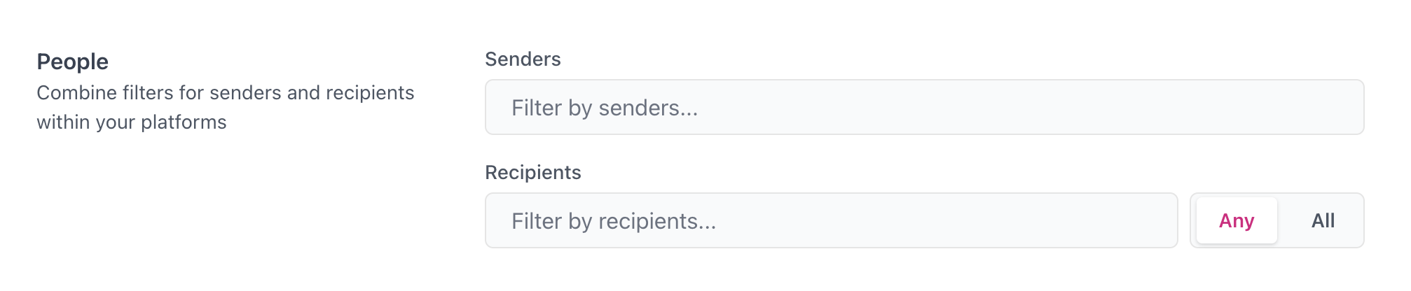 Use the Any/All toggle switch to change between finding content that was sent to all of the identities specified in the recipients field, or any one of the identities specified.