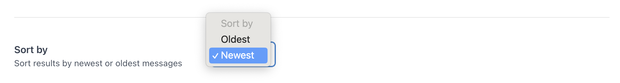You can choose the order in which the results will by returned by using the Sort by option. At the moment, the current sort options are by newest messages first, and by oldest messages first