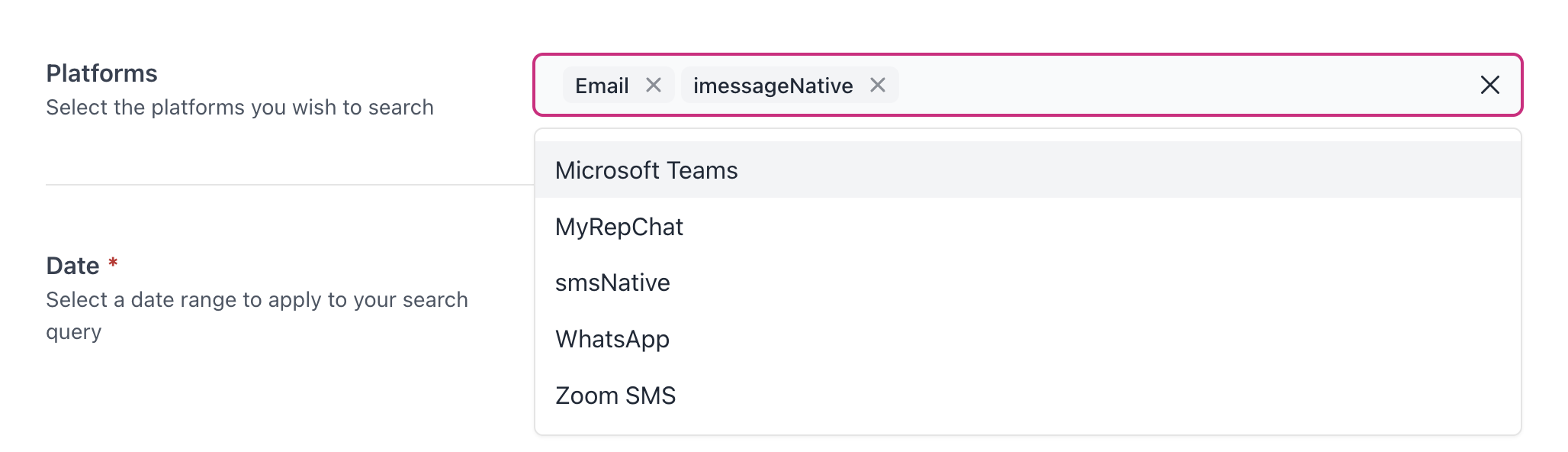 Recipients: Filter your search to only include communications received by the email addresses, phone numbers, or platform identities you specify.